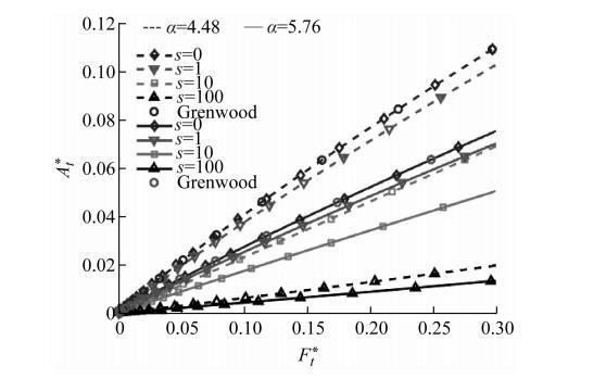 無量綱真實接觸面積At*與無量綱兩表面平均距離u的關(guān)系:兩表面間平均距離越大,真實接觸面積越小,且二者呈非線性關(guān)系。當(dāng)兩表面間平均距離不變時,表面張力越大,真實接觸面積越小,這是由于表面張力的作用引起的。同理,當(dāng)忽略表面張力時(s=0),其結(jié)果與Greenwood所得結(jié)果吻合。此外,當(dāng)表面張力相同時,表面粗糙度較大時,真實接觸面積較小。這里由于選取的兩組表面形貌參數(shù)所對應(yīng)的粗糙度相差不大,所以真實接觸面積的差別很小。