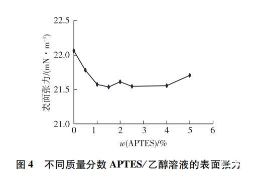 液體對固體粉末粗糙表面的浸潤性與溶液的表面張力有關, APTES分子只能在液體與固體粉末接觸面積區域內進行分子自組裝。圖 4是不同質量分數 APTES/乙醇溶液的表面張力。由圖 4可見,在質量分數小于 4% 的條件內,不同質量分數 APTES/乙醇溶液與純乙醇的表面張力相差不大,可以認為絹云母粉末在不同質量分數 APTES/乙醇溶液中的浸潤性相當,即在不同質量分數下, APTES與絹云母粉末的接觸面積相等。