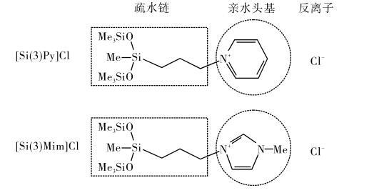 近年來,已有多種表面活性劑在水中的吸附機理被深入研究,然而這些表面活性劑分子大多是直鏈且頭基較小,對于含有支鏈且頭基較大的有機硅離子液體型表面活性劑水溶液的動態表面張力的研究卻鮮有報道。為此,筆者主要研究三硅氧烷吡啶類離子液體([Si(3)Py]Cl)和三硅氧烷咪唑類離子液體([Si(3)Mim]Cl)水溶液在不同溫度和濃度下的動態表面張力,并初步探討2種離子液體在水中的吸附機理,旨在為這2種離子液體的進一步應用提供理論基礎。2種離子液體的分子結構示意圖如下:
