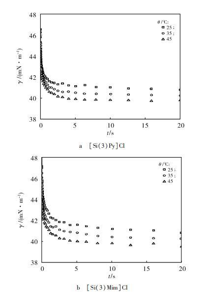 在Delta-8全自動高通量表面張力儀上測定10 ms~100 s的一定濃度的[Si(3)Py]Cl和[Si(3)Mim]Cl水溶液分別在25,35和45℃時的動態表面張力。