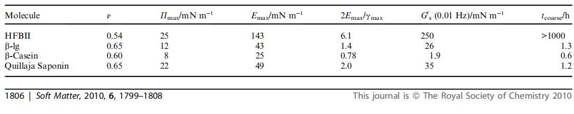 當(dāng)我們現(xiàn)在再次考慮表1中的2Emax/gmax比率時(shí),很明顯HFBII超過(guò)了5的值,這表明這將穩(wěn)定泡沫,防止收縮。 根據(jù)Kloek等人的說(shuō)法,對(duì)于b-乳球蛋白和皂甙,我們報(bào)告的值介于1和2之間,表明氣泡收縮延遲,但沒(méi)有完全停止。2食品蛋白質(zhì)通常屬于這種狀態(tài),對(duì)歧化過(guò)程的抵抗力相對(duì)較小。10最后, 根據(jù)這個(gè)比率,b-酪蛋白根本無(wú)法抵消氣泡收縮,因?yàn)?Emax/gmax<1,這是主要的吉布斯標(biāo)準(zhǔn)。