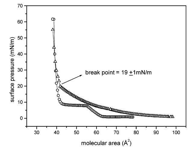 圖1.朗繆爾單分子膜的表面壓力-面積曲線:純DMPA(O)和DSAP/DMPA(1:3500,mol:mol)(4)。 曲線中顯示的斷點(diǎn)與混合單層的LE-LC轉(zhuǎn)變有關(guān)。