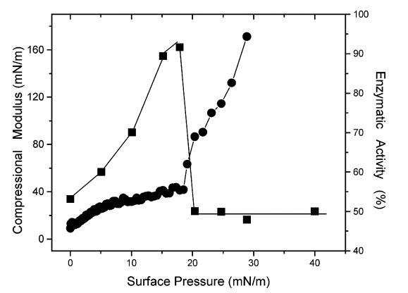 圖3.(9)在幾種表面壓力下,DSAP/DMPA(1:3500,mol:mol)混合單分子膜中DSAP的PNPPA酶活性。(b)DSAP/DMPA混合單分子膜的壓縮模量。酶活性表示為均相介質(zhì)中估計(jì)值的百分比。