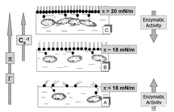 圖5. 在(A)以下、(C)以上和(B)值的表面壓力下,酶/磷脂混合單層的DSAP取向示意圖模型,觀察到單層表面壓縮模量的突然增加。 橫向箭頭表示表面壓力(π)、估計(jì)的酶表面密度(Γ)和壓縮模量(Cs-1)的增加方向。