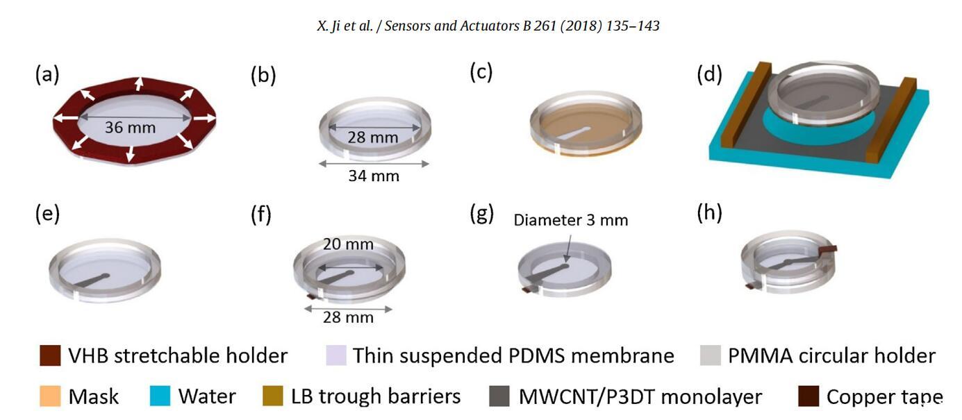 圖2。采用LS技術制備1.4μm厚DEA的工藝。(a)懸浮式PDM(Sylgard 186)等雙軸預拉伸(初始厚度:2.0μm,拉伸后:1.4μm)。(b)懸浮拉伸1.4μm厚的PDMS膜,固定在PMMA支架上。(c)在懸浮膜上放置一個面罩。(d)在空氣-水界面形成的單層電極在帶有掩膜的懸浮PDMS膜上的LS轉(zhuǎn)移。(e)PDMS上的圖案化單層電極。(f)將覆蓋有圖案化單層電極的PDMS膜轉(zhuǎn)移到較小的PMMA支架上。(g)圖案化單層電極位于PDMS的下側(cè),電極與銅帶連接,PDMS的上側(cè)不帶電極。(h)采用LS電極技術制造DEA。