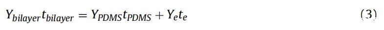 測量裸PDMS膜的楊氏模量后,將單層電極轉(zhuǎn)移到這些PDMS膜上。使用與裸PDMS膜相同的參數(shù)測定PDMS+電極雙層的楊氏模量。PDMS+電極雙層由兩個長度和寬度相等的粘附層形成,因此使用[33]計算電極楊氏模量: