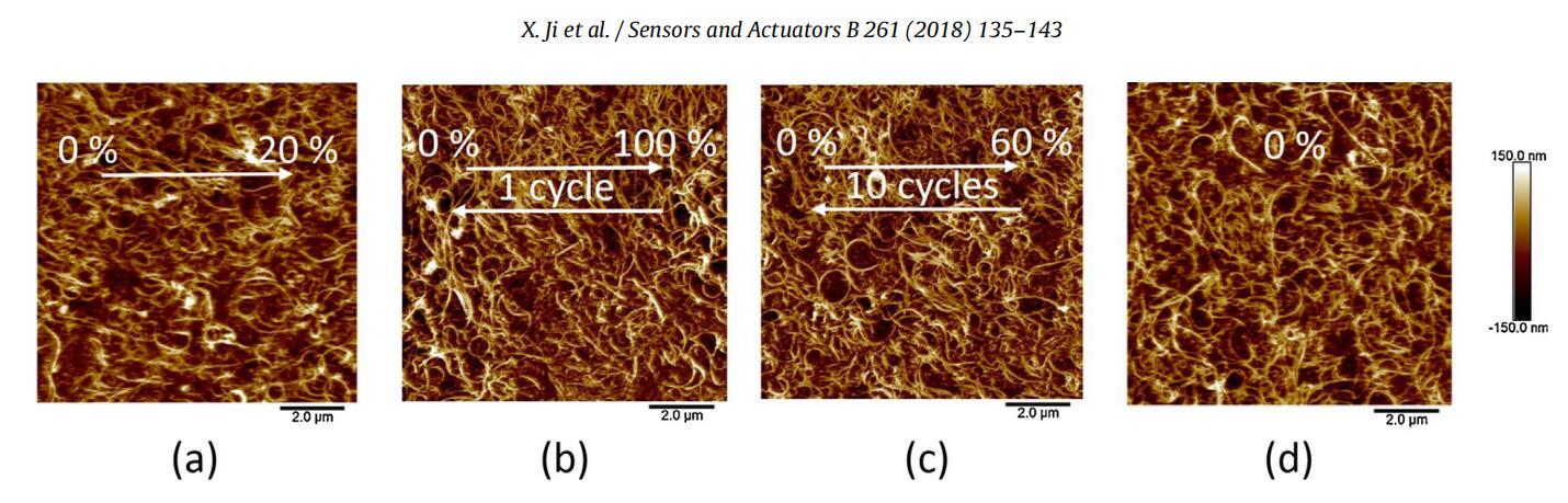 從圖5a(施加在PDMS基板上的20%單軸應變)可以看出,WCNT在拉伸方向上輕微變形,但保持互連。對于應變為0%的器件,在100%單軸應變后或在60%單軸應變的10個周期后拍攝,AFM圖像顯示互連的MWCNT網絡,表明拉伸至100%(圖5b)或在60%單軸應變的10個周期后(圖5c)不會破壞網絡。對于所有拉伸條件,與未施加任何應變的樣品相比,一旦樣品松弛至0%應變,則在該長度范圍內未檢測到顯著的形態變化(圖5d)。