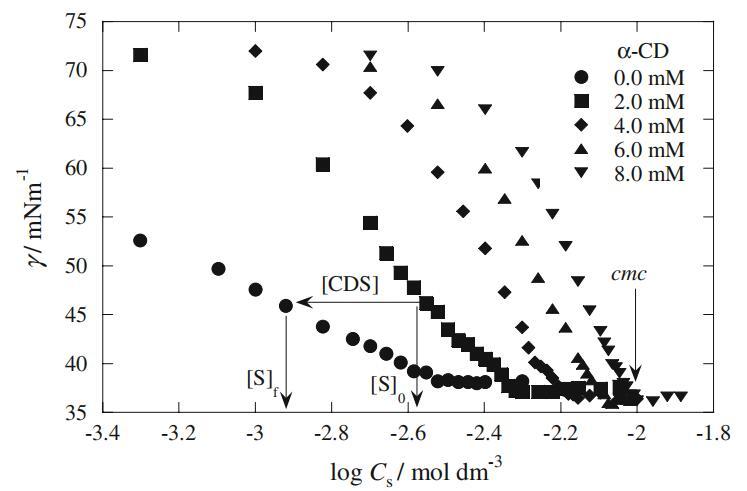 圖2界面張力γ與對數(shù)Cs/mol dm的曲線圖?不同α-CD濃度下Mega-10+DPS混合系統(tǒng)的α-DPS的3=0.80