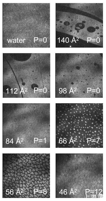 圖3。水上不同密度DPPC的布儒斯特角顯微鏡圖像。圖像大小為600×600μm。白色區(qū)域表示高密度,而黑色區(qū)域表示低密度。在每個(gè)面板中,每個(gè)分子的面積(單位為?2)在左下角報(bào)告,表面壓力(單位為mN/m)在右下角報(bào)告。這些照片是用自動(dòng)調(diào)整靈敏度的相機(jī)拍攝的,這樣就無法比較圖像之間的灰度等級(jí)。