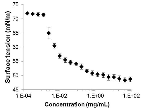 圖2。牛精漿溶液在空氣-水界面的表面張力(±標準偏差),與提取物中所含蛋白質的濃度有關,并以對數標度表示(T=23.2?C±0.3?C、n=2,每個樣品重復4次)。