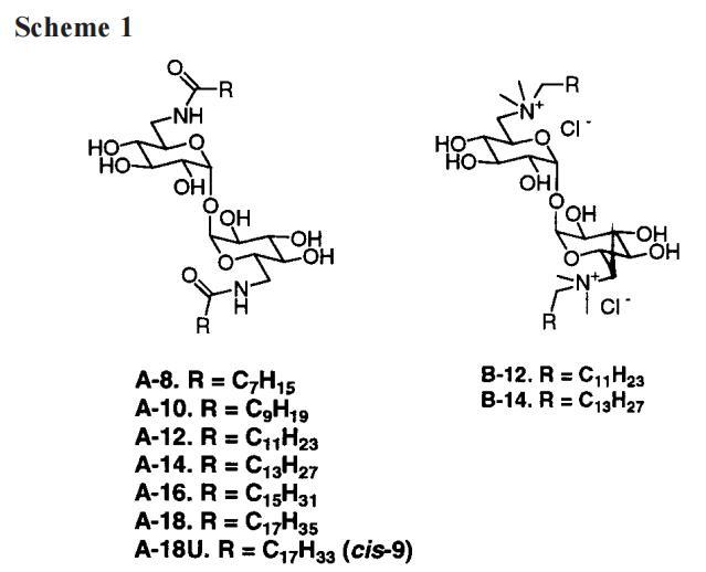 本文研究以海藻糖為間隔基的雙子座(方案1)。A系列由海藻糖組成,其6-和6′-羥基被長鏈酰胺取代。B系列在6-和6′位置有長鏈季銨鹽基團(tuán)。我們選擇海藻糖作為糖間隔物并不是隨意的。首先,海藻糖是一種雙糖,允許兩條烴鏈相隔相當(dāng)長的距離。雙子座中受限的分子內(nèi)鏈/鏈相互作用是一種結(jié)構(gòu)特征,過去僅對(duì)其進(jìn)行了簡(jiǎn)要研究。15秒后,海藻糖(一種從細(xì)菌、藻類、昆蟲和植物等多種自然來源中分離出來的糖)可以保護(hù)生物膜免受脫水的壓力。16因此,在生物膜的“細(xì)胞模擬”建模方面,我們對(duì)海藻糖雙子感興趣。17第三,從實(shí)用的角度來看,海藻糖很有吸引力,因?yàn)樗瑑蓚€(gè)完全相同的D-葡聚糖單元。這簡(jiǎn)化了化合物的合成和分析,與大多數(shù)其他雙糖相比,化學(xué)性質(zhì)不同的羥基數(shù)量減少了一半。但盡管對(duì)稱,合成純海藻糖雙子座的途徑(方案2和方案3)無疑是隨后物理化學(xué)的一個(gè)乏味的序言。
