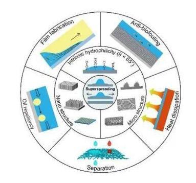 文章介紹了經過億萬年進化后自然界中選擇留下的各種優異超鋪展表面,包括動物角膜、宣紙等。自然界中超鋪展表面的優異性能直接決定了其正常作用的發揮甚至其生理功能。這些自然表面均使用了微納復合的多尺度結構來實現超鋪展性能;從分子尺度的表面自組裝水分子結構引起的新的親疏水界線(65°)到納米結構和微觀結構在超鋪展過程中的宏觀各自作用,綜述了超鋪展本質機理研究的最新進展;進一步總結了常用的超鋪展表面制備方法、介紹了超鋪展表面的應用領域,提出了超鋪展體系,總結了該領域存在的挑戰。