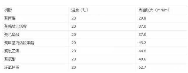 由于高分子沒有氣態,即樹脂氣相的蒸氣壓為零。因此,與液態樹脂共存的只有氣相。固體樹脂表面張力的測定有很大的困難,因此,固體的表面張力一般是通過間接方法進行測定的,對于涂層而可以先測定樹脂熔體的表面張力,再根據表面張力與溫度的關系進行外推。表1列出了一些樹脂從液態外推至固體時的表面張力值。
