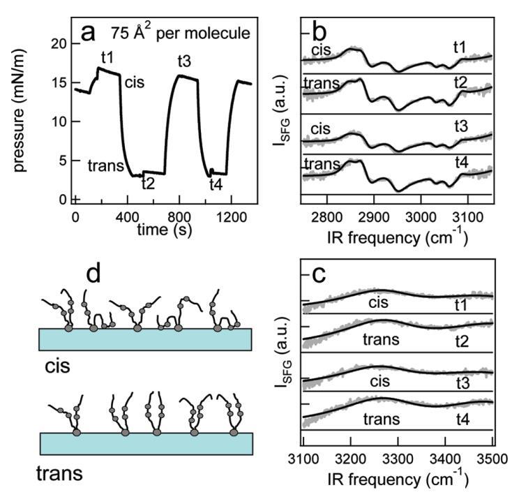 圖4:(a)在每分子75?2的面積處,脂質(zhì)/H2O界面處的光開(kāi)關(guān)脂質(zhì)的表面壓力作為時(shí)間的函數(shù)。370和450 nm光照射~100秒分別產(chǎn)生cis(高壓)和trans(低壓)狀態(tài)。壓力的微小劇烈波動(dòng)是由于樣品高度的變化,以校正水的蒸發(fā)。(b和c)CH和OH區(qū)域(灰色)中相應(yīng)的VSFG光譜,以及洛倫茲線(xiàn)形狀模型的擬合(見(jiàn)正文)。為了清晰起見(jiàn),對(duì)光譜進(jìn)行了偏移。t1至t4對(duì)應(yīng)于面板a中進(jìn)行光譜測(cè)量的時(shí)間。(d)脂質(zhì)尾部方向示意圖。光開(kāi)關(guān)脂質(zhì)的偶氮苯部分用灰色圓圈表示。