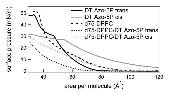 圖2:反式和順式狀態(tài)下的光開(kāi)關(guān)脂質(zhì)DT Azo-5P的表面壓力與面積等溫線(xiàn)(實(shí)線(xiàn)),d75-DPPC的表面壓力與面積等溫線(xiàn)(虛線(xiàn)),以及光開(kāi)關(guān)兩種狀態(tài)下的1:5摩爾比的光開(kāi)關(guān)脂質(zhì)與d75 DPPC的表面壓力與面積等溫線(xiàn)(虛線(xiàn))。