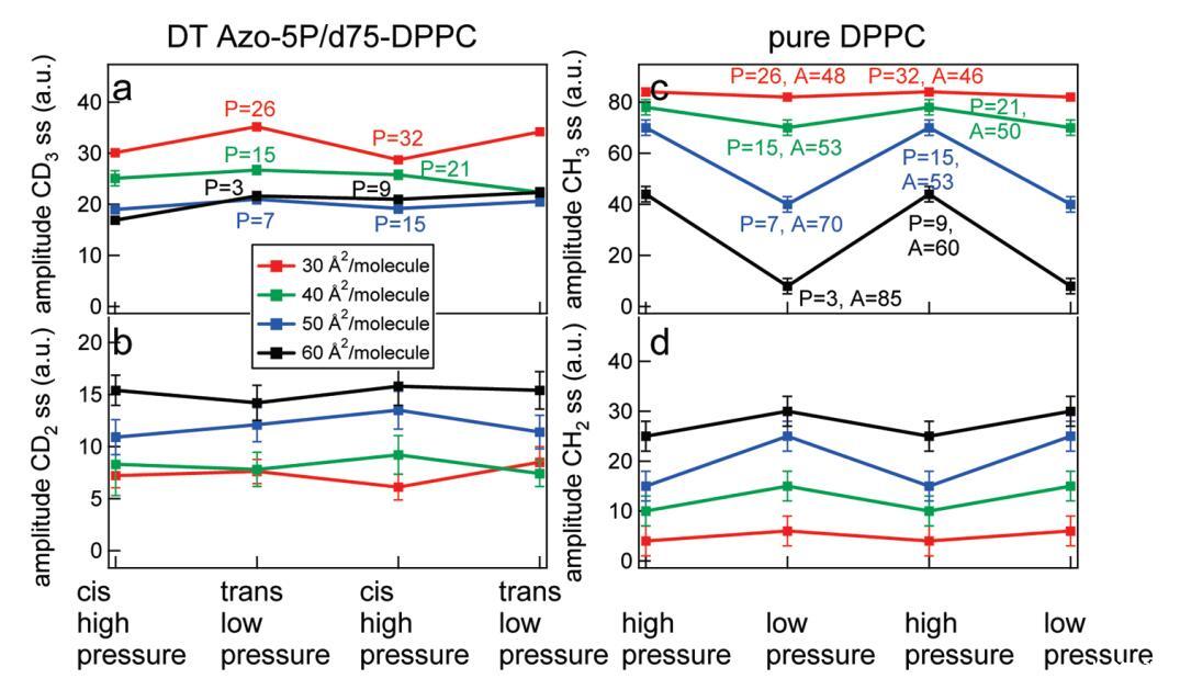 為了更定量地了解分子順序,圖8 a和b部分給出了四種不同密度下DPPC的CD3和CD2對(duì)稱(chēng)拉伸模式的振幅,擬合結(jié)果如圖6b和7b(黑線(xiàn))所示。正如預(yù)期的那樣,在順式和反式狀態(tài)下,CD3振幅隨著密度的增加而增加,CD2振幅則隨著密度的增加而減少(每個(gè)分子的面積較低),如圖中不同的顏色所示。這是由于隨著密度的增加,通過(guò)減少笨拙缺陷的數(shù)量來(lái)矯直烷基鏈。隨著密度的增加,階數(shù)增加,表面壓力也增加。值得注意的是,當(dāng)通過(guò)從反式到順式(而不是通過(guò)增加表面覆蓋率)來(lái)增加壓力時(shí),CD3和CD2之間的反相關(guān)仍然存在,但現(xiàn)在壓力的增加使CD3振幅下降,CD2振幅上升(我們注意到,鑒于實(shí)驗(yàn)數(shù)據(jù)點(diǎn)上的誤差條,后一個(gè)結(jié)論是暫時(shí)的)。為了強(qiáng)調(diào)DPPC/DT Azo-5P混合物的這種違反直覺(jué)的行為,圖8的右面板顯示了相同對(duì)應(yīng)壓力下純正常DPPC的擬合結(jié)果。右面板中的每個(gè)數(shù)據(jù)點(diǎn)模擬左面板中點(diǎn)的壓力;我們比較壓力,而不是密度。顯然,改變壓力對(duì)純DPPC的影響比對(duì)混合物的影響大得多。在非常低的壓力(P=3)下,混合物中CD3對(duì)稱(chēng)拉伸模式有明顯的信號(hào),但純DPPC幾乎沒(méi)有信號(hào);光開(kāi)關(guān)脂質(zhì)的存在誘導(dǎo)了已經(jīng)處于非常低壓力下的高階CD3基團(tuán)。對(duì)于高壓,純DPPC的CH2模式幾乎完全消失,而對(duì)于混合物,仍然存在清晰的CD2信號(hào);如果存在DT Azo-5P,則尾部的有序性較低。這并不奇怪,因?yàn)镈T偶氮-5P脂質(zhì)會(huì)在完全壓縮的DPPC單層中起到填充缺陷的作用。此外,在低密度(壓力高達(dá)~15 mN/m)改變壓力對(duì)純DPPC的影響比對(duì)混合物的影響更顯著。顯然,光開(kāi)關(guān)脂質(zhì)對(duì)壓力的影響大于對(duì)脂質(zhì)分子順序的影響。