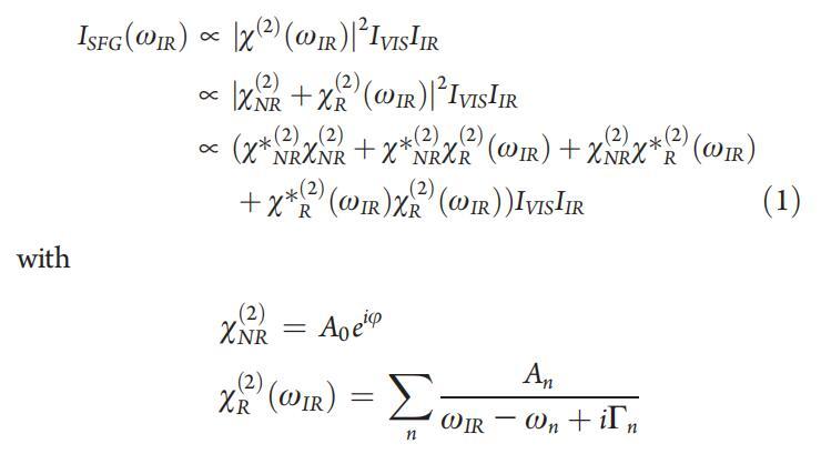 圖3:。在密度為75?2/分子和壓力為~3 mN/m。共振信號(hào)疊加在大型非共振背景上,由于共振信號(hào)和非共振信號(hào)之間的干擾,導(dǎo)致色散線(xiàn)型。黑色虛線(xiàn)表示NR振幅設(shè)置為零時(shí)的DT Azo-5P信號(hào)。
