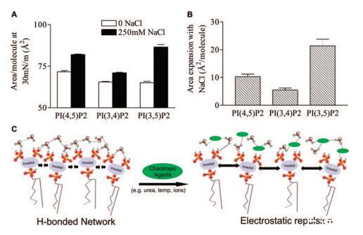 圖5:。亞相氯化鈉膨脹效應(yīng)的PIP2異構(gòu)體特異性。(A)HEPES緩沖亞相上的DO-PIP2異構(gòu)體在π)30 mN/m時(shí)的每分子面積。平均值(SE,n)7。(B)250 mM NaCl和無亞相NaCl之間DOPIP2異構(gòu)體的每分子面積差異。通過雙向ANOVA測量,NaCl效應(yīng)的異構(gòu)體依賴性顯著達(dá)到p)0.0001。(C)PIP2分子間相互作用的概念動畫。在沒有潮向性試劑(綠色橢圓)的情況下,PIP2分子形成水介導(dǎo)的氫鍵網(wǎng)絡(luò)。當(dāng)添加潮向性聚合物時(shí),網(wǎng)絡(luò)被破壞,帶電磷酸鹽之間的靜電排斥導(dǎo)致單層的膨脹。
