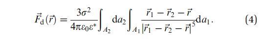 其中Ai表示域i的面積,dai表示其面積元素,-ri表示其相對于域中心的位置向量,i=1,2-r是從域1中心到域2中心的向量,如圖1所示。e0是真空介電常數(shù),ew和ea分別是水和空氣的相對介電常數(shù)。在這里,我們使用了Urbakh等人21的研究結(jié)果,該研究描述了由兩個(gè)半無限介質(zhì)包圍的薄電介質(zhì)層中偶極子之間的相互作用。