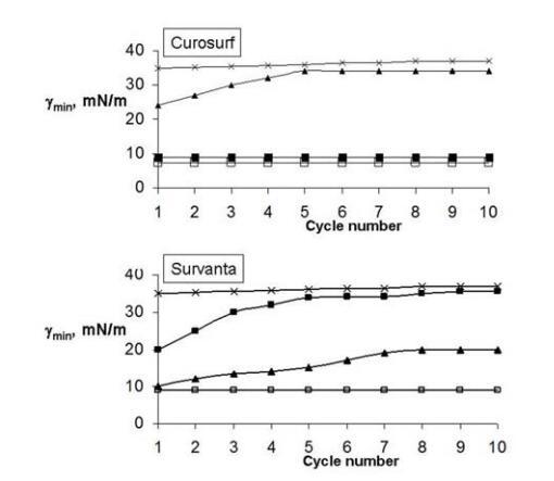 圖1.Curosurf(上圖)和Survanta(下圖)單層的最小表面張力(γmin)對壓縮/減壓循環次數的依賴性。符號表示:□-純空氣/水界面處的ESP(鹽水溶液亞相上);在BSA亞相上的x-ESPs(2mg/ml);■-在BSA(2mg/ml)和5%葡聚糖的亞相上進行ESPs;▲-在BSA亞相(2mg/ml)和5%PEG 10000上進行ESP。ESP作為脂質體懸浮液擴散,最終濃度為15μg磷脂/ml。實驗在0.15 M NaCl、pH 6.8-7.0、T=25℃下進行。