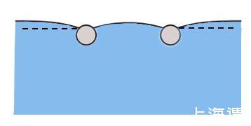 麥片圈效應(yīng)中使得麥片相互吸引的因素是麥片之間的橫向毛細(xì)力(Lateral Capillary Force),橫向毛細(xì)力可分為吸引力和排斥力,這里表現(xiàn)為吸引力。我們通過一個簡單的例子,來說明一下橫向毛細(xì)力產(chǎn)生的原因。首先考慮單個小球放置在液面上保持平衡,意即在重力的作用下對液面形成一個擾動,此時若液面上存在另外一個小球時,這種擾動會相互疊加,下圖中的液面便是最終的擾動狀態(tài)。