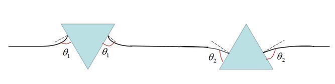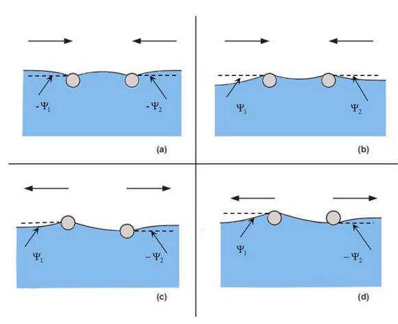 上圖便是水上兩個漂浮小球的吸引與排斥的判斷方法。值得注意的是,我們這里并沒有提及小球的浸潤性,也就是說,浸潤性與橫向毛細(xì)力的性質(zhì)并不直接相關(guān)。實際上,橫向毛細(xì)力還可以分為漂浮橫向毛細(xì)力和浸沒橫向毛細(xì)力。我們討論的情況是漂浮橫向毛細(xì)力,由小球的重力引起,題主的所說的浸潤性應(yīng)該換為小球的輕重(與水相比)。例如圖(a)里是兩個比水重的小球,表面張力將其往上拉。圖(b)是兩個比水輕的小球,表面張力將其往下拉。表面張力的方向恰好就對應(yīng)了前述接觸線處液面的傾斜角。題主的所要表達(dá)的意思其實是: