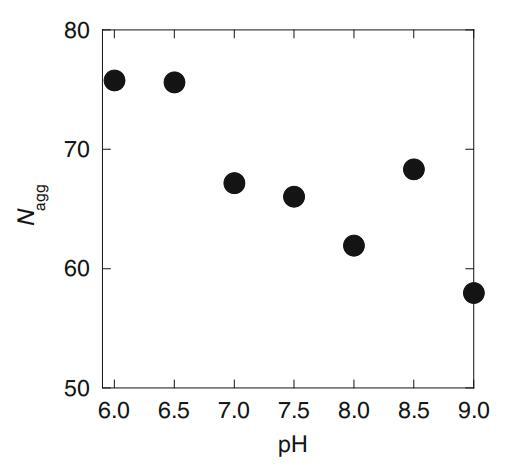 為了評估膠束(Nagg)的聚集數,我們使用帶有猝滅劑(HPYL)的探針(Py)的穩態熒光猝滅方法[8]。已發現該探針-猝滅劑對適用于評估幾種膠束系統的Nagg[14,15]。Cs=25 mM時的評估Nagg值如圖7所示。如圖所示,Nagg數值總體上隨著pH值的增加而降低。然而,似乎在pH 6.5-7附近也存在一個斷裂點。如果是這樣,膠束中HLA的pKa預計在6.5到7.0之間,這也比水溶液中的pKa大,就像空氣-水界面的結果一樣。為了進行進一步討論,我們需要更精確地確定這些Nagg值。