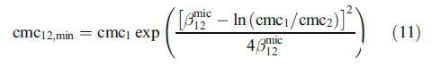另一方面,在混合膠束形成過程中,含有兩種表面活性劑的混合物中協同作用的存在不僅取決于它們之間相互作用的強度,還取決于二元兩親混合物中單個表面活性劑組分的相關性質[23]。因此,混合膠束形成中協同作用所需的條件是bmic 12必須為負(見上節),且βmic 12>jlnecmc1=cmc2Tj(表2)。對于本二元混合物,這兩個條件都滿足?;旌夏z束形成中可能的協同程度通過混合表面活性劑的摩爾濃度與單個組分的摩爾濃度相比的最大降低來測量,即(cmc1)?cmc12,min)/(cmc1),其中cmc12,min是混合表面活性劑的最小cmc,由下式給出:
