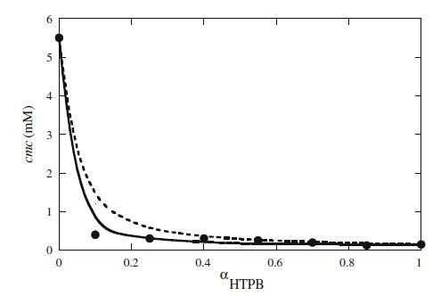 圖2 HTPB+Mega-10混合體系混合臨界膠束濃度(cmc)與αHTPB的關(guān)系圖。填充的圓圈表示實驗cmc。虛線表示HTPB+Mega-10混合體系理想行為的相分離模型,而實線最符合RST和βmic 12的數(shù)據(jù)=?3.91