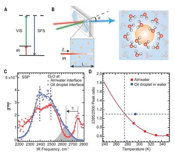 氫的疏水性代表了一種基本的物理性質,它決定了水介質中的各種過程,如蛋白質折疊、自組裝和聚集。亞微米級疏水油滴或水微粒是了解疏水作用機理的重要模型系統(tǒng)。然而,這些界面的電荷和結構都有很大的爭議。雖然電荷轉移模型表明水是油滴電荷存在的關鍵,但油滴旁邊的水的結構同樣存在爭議。因此,疏水液體材料旁邊的水的結構仍然是未知的。