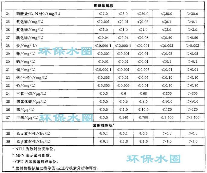 依據(jù)我國(guó)地下水質(zhì)量狀況和人體健康風(fēng)險(xiǎn),參照生活飲用水、工業(yè)、農(nóng)業(yè)等用水質(zhì)量要求,依據(jù)各組分含量高低(pH除外),分為五類。