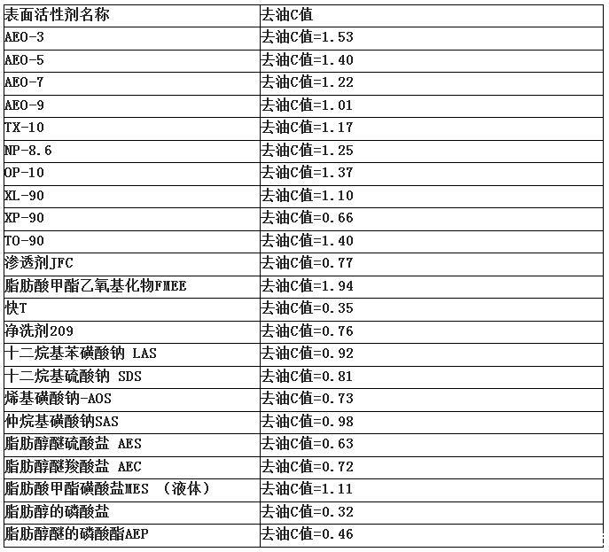 C=試樣去油質量/標準配方去油質量,C值越大,表明表面活性劑的去油能力越強。