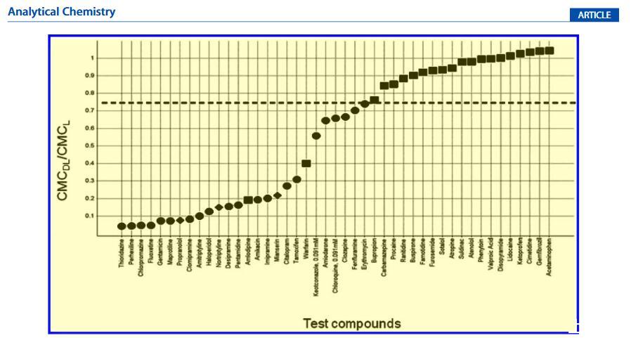 測定了45種商業(yè)化合物的藥物脂質(zhì)復(fù)合物的CMC值,并與在人類、動物或培養(yǎng)細(xì)胞中觀察到的PLD進(jìn)行比較(表1)。正如文獻(xiàn)中所建議的那樣,這些化合物分別分為四類。19,27 CMC偏移的程度由CMC比率(CMCDL/CMCL)表示(圖3)。將來自人類、動物或培養(yǎng)細(xì)胞的PLD數(shù)據(jù)與使用這種熒光方法檢測到的CMC偏移進(jìn)行比較(圖3)并使用CMC比率在