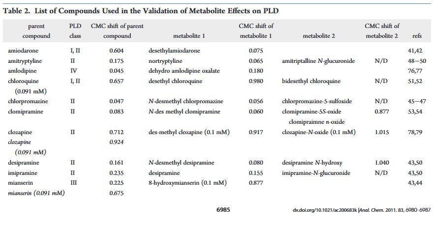 已經(jīng)有許多出版物描述了PLD藥物代謝產(chǎn)物所致。其中,初級代謝輕的胺碘酮,去乙基胺碘酮,已經(jīng)討論過14,38-40優(yōu)先積累代謝物已觀察到胺碘酮過量,尤其是短期39這為我們的檢測數(shù)據(jù)提供了可能的解釋其中去乙基胺碘酮是胺碘酮的主要代謝物,41,42表現(xiàn)出更高的PLD誘導潛力。相似地,8-羥基米安色林之間的CMC位移差異,米安色林、43,44和米安色林的主要氧化代謝物比其他兩個之間的差異更顯著成對的親本和代謝物。由于溶解度的限制,父母和代謝組的劑量濃度不同氯氮平和米安色林。這可能是導致觀察到的CMC偏移的顯著差異母體和代謝物之間。在較低濃度下測試時相比之下,氯氮平從低電位誘導劑轉變?yōu)榉钦T導劑,而米安色林仍然作為誘導劑但具有更高的CMCDL/CMCL值。值得注意的是,目前測試集中的大多數(shù)CAD被報告為氧化代謝其相應的脫烷基初級代謝物。為了了解相應初級的PLD電位代謝物,我們測試了額外的代謝物。之間測試的代謝物是初級去甲基代謝物氯丙嗪、45?47阿米替林、48?50丙咪嗪、43,50和pri-氯喹的瑪麗和次級脫乙基代謝物。51,52此外,由雜原子氧化形成的氧化代謝物地昔帕明43,50和氯胺酮的重釋和脫烷基代謝物pramine53,54進行了評估。與其他CAD一樣,代謝物可以如果它們具有合適的理化性質,則誘導PLD。32相反,代謝物將失去結合能力如果CAD特征丟失,則使用脂質,例如用脂質觀察氯米帕明N-氧化物和地昔帕明N-羥基(圖4和表2)。