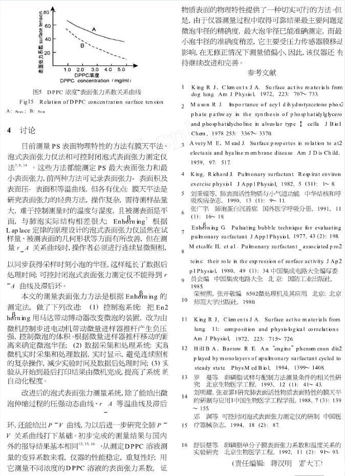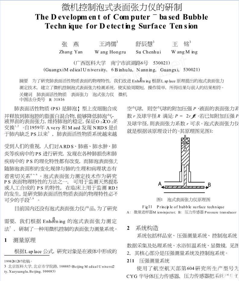 為了研究肺表面活性物質表面的物理特性,我們改進Enhorning根據Laplace原理提出的泡式表面張力測定技術,建立了微機控制泡式表面張力檢測系統,使實驗周期短,操作簡單,所得結果與前人的結果相符。
