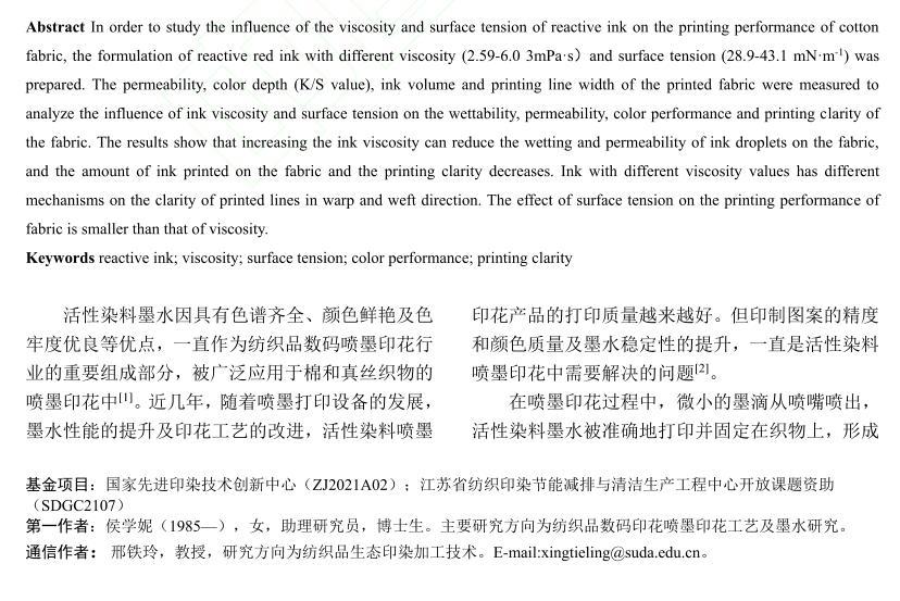 【摘要】:為了研究活性染料墨水黏度和表面張力對棉織物印花性能的影響,配制不同黏度和表面張力的活性紅墨水,測試打印后織物的滲透率、K/S值、墨量及打印線寬等指標。結果表明:提高墨水黏度會降低墨滴在織物上的潤濕和滲透性能,打印到織物的墨量減少,打印清晰度下降。不同黏度的墨水對打印線條經緯向的清晰度影響機制不同,表面張力對織物打印性能的影響比黏度小。
