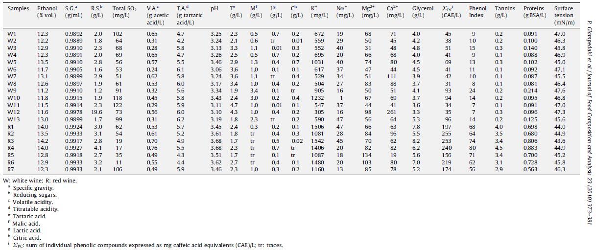 檢測到乙醇、蛋白質(zhì)和單寧對水性、水醇和模型葡萄酒標(biāo)準(zhǔn)溶液的表面張力有顯著影響,以及上述基質(zhì)之間的重要變化后,我們認(rèn)為繼續(xù)對真實(shí)葡萄酒樣品進(jìn)行研究很有趣。 我們的目標(biāo)是評(píng)估盡可能多的其他葡萄酒化合物對表面張力的影響,獲得統(tǒng)計(jì)相關(guān)性,最后,基于對葡萄酒表面張力的簡單測量,獲得基本釀酒參數(shù)值的預(yù)測模型。