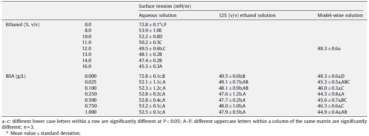 關(guān)于 BSA 溶液,觀察到表面張力值的顯著變化。 隨著 BSA 含量的增加,不僅在同一基質(zhì)內(nèi)發(fā)現(xiàn)差異,而且在三種不同基質(zhì)之間也存在差異(表 1)。 正如預(yù)期的那樣,所使用的白蛋白表現(xiàn)出很強(qiáng)的表面活性,并導(dǎo)致溶液表面張力顯著降低,測得的最低值 (44.3 mN/m) 是含 0.250 g BSA/L 的模型酒溶液的值。