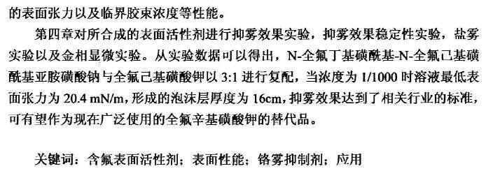 第四章對所合成的表面活性劑進行抑霧效果實驗,抑霧效果穩定性實驗,鹽霧實驗以及金相顯微實驗。從實驗數據可以得出,N-全氟丁基磺酰基-N-全氟己基磺酰基亞胺磺酸鈉與全氟己基磺酸鉀以3:1進行復配,當濃度為1/1000時溶液最低表面張力為20.4mN/m,形成的泡沫層厚度為16cm,抑霧效果達到了相關行業的標準,可有望作為現在廣泛使用的全氟辛基磺酸鉀的替代品。