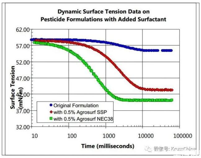 例如我們用KRSS的BP100動態表面張力儀測試添加了兩種不同表面活性劑農藥的動態表面張力。噴霧過程中尺寸效應的關鍵因素為初始表面張力降低的快慢,即通常認為是液滴形成后前250ms內的表面張力。從這個尺度來看,上述兩個皆不是優異的表面活性劑。
