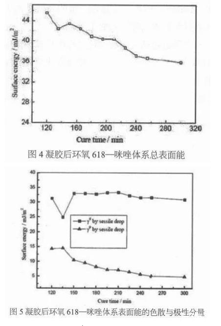 馬全勝通過研究恒溫固化過程中環氧樹脂體系凝膠后表面能的的變化規律,結合固化機制和反應特性,分析環氧618-咪唑體系表面能的色散分量、極性分量的變化。