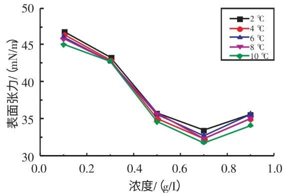 2.2.1不同溫度下十二烷基苯磺酸鈉溶液表面張力與濃度的關系實驗研究了在溫度為2、4、6、8、10℃條件下,SDBS溶液的表面張力與濃度的關系(見圖3)。由圖3可知,當濃度在0.1~0.7 g/L時,隨著SDBS溶液濃度的升高,其表面張力逐漸減??;當濃度在0.7~0.9 g/L時,隨著SDBS溶液濃度的升高,其表面張力逐漸增大。當SDBS溶液濃度為0.7 g/L時,其表面張力取得最小值。