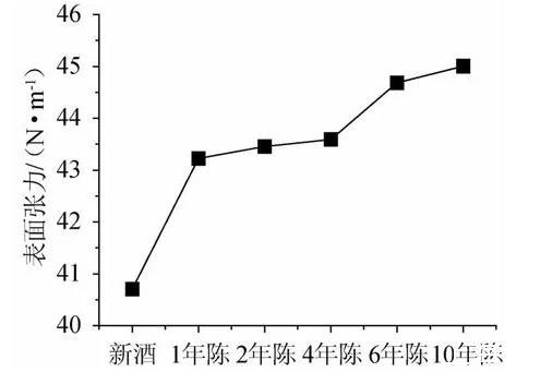 表面張力為衡量液體體系的一個熱力學(xué)穩(wěn)定性參數(shù),黃酒從本質(zhì)來講就是乙醇-水分子的締合體系與其他氨基酸、微量風(fēng)味物質(zhì)等構(gòu)成的液體體系,所以黃酒具有一般液體所具有的本質(zhì)屬性。實驗所用黃酒為不同年份相同工藝釀造的黃酒原酒,可以認(rèn)為這些酒樣具有一定的穩(wěn)定性,可以用來研究黃酒在陳釀過程中的陳化特征規(guī)律。按照表面張力分析方法檢測6個年份黃酒的表面張力,結(jié)果如下圖,可以看出,黃酒的表面張力隨著陳釀時間延長整體呈上升趨勢。