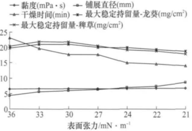 通過本研究可以說明適當(dāng)?shù)亟档筒莞熟⒅苿┑谋砻鎻埩蛟黾羽ざ染商岣叱輨┑纳锘钚浴3輨┗钚阅芊癯浞职l(fā)揮往往決定于霧滴在雜草葉表面的黏著、展布、濕潤、滲透與傳導(dǎo)。不同雜草的葉片結(jié)構(gòu)及生理機制往往對藥液理化性狀和藥液敏感性不同,本研究中液滴的鋪展直徑、干燥時間均采用石蠟?zāi)M植物葉片蠟質(zhì)層結(jié)構(gòu),僅能體現(xiàn)藥液理化性狀的相對變化趨勢,而不同類型的雜草對藥液物理性狀和藥液敏感性需進(jìn)一步研究。