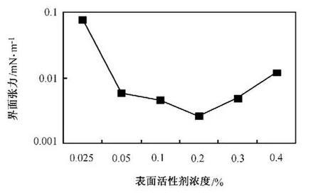 界面張力隨著表面活性劑濃度的增加先減小后略有增加。這是由于表面活性劑在濃度較低時,在油水界面上吸附的分子較少,分子排列不夠緊密且不規則,界面張力較大;濃度增大時,油水界面上吸附的分子逐漸增多,分子排列變得緊密而整齊,達到吸附飽和,界面張力急劇下降;繼續增大表面活性劑的濃度時,在油滴附近開始出現膠團,阻止了部分表面活性劑在油水界面的吸附,界面張力開始回升。