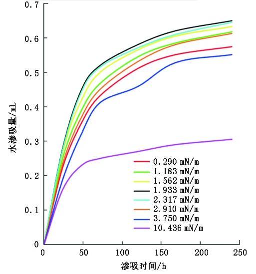 圖2界面張力對最終水滲吸體積的影響(試驗結果)