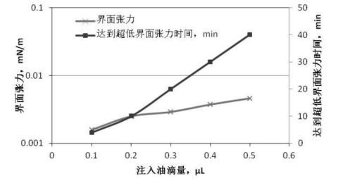 圖3、圖4是根據(jù)前述實(shí)驗(yàn)步驟1、2提供的配置與測(cè)量方法,油滴注入量分別為0.1μL、0.2μL、0.3μL、0.4μL、0.5μL,無堿二元驅(qū)配方體系與高凝油間界面張力的關(guān)系曲線。從圖2可知:無堿二元驅(qū)配方體系與高凝油間的界面張力達(dá)到超低界面張力的時(shí)間隨著油滴注入量的增多明顯延長(zhǎng),注入油滴0.1μL,4分鐘達(dá)到超低界面張力,注入油滴0.5μL,40分鐘達(dá)到超低界面張力;從圖4可知:注入油滴量大于0.3μL以后,對(duì)無堿二元驅(qū)配方體系與高凝油間界面張力的測(cè)定不能持續(xù)2小時(shí),油滴在100分鐘發(fā)生斷開,對(duì)于高凝油而言,油滴注入量小于0.3μL較適合。