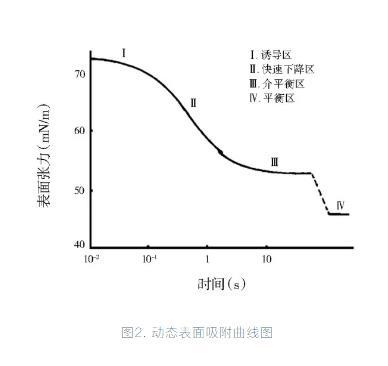 許多體系的動(dòng)態(tài)表面張力和時(shí)間對(duì)數(shù)的曲線可分為4個(gè)階段:誘導(dǎo)區(qū)、表面張力快速下降區(qū)、介平衡區(qū)和平衡區(qū)。在誘導(dǎo)區(qū),由于吸附在界面層上的助劑質(zhì)量濃度太低,溶液的表面張力較大;隨著助劑大量被吸附到溶液表面,表面張力急劇降低,就形成了快速下降區(qū);而隨著溶液表面助劑分子的積累,吸附接近飽和時(shí)吸附速度變慢,就形成了介平衡區(qū);足夠長的時(shí)間后當(dāng)表面吸附達(dá)到飽和體系進(jìn)入動(dòng)態(tài)平衡階段表面張力達(dá)到平衡,此即為平衡表面張力。表面活性劑種類和質(zhì)量濃度不同,其溶液體系達(dá)到上述各階段所需時(shí)間不同,表現(xiàn)為各溶液體系間動(dòng)態(tài)表面活性的差異。